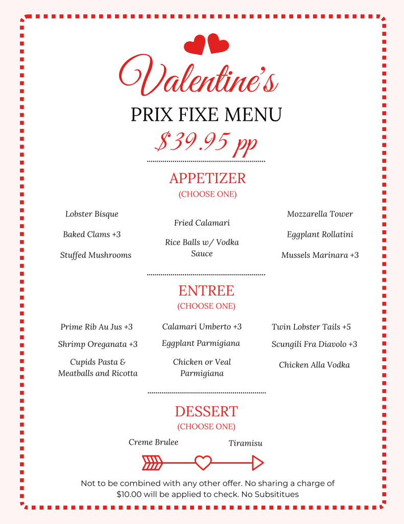 Celebrate love and indulge in an unforgettable dining event at Prince Umberto this Valentine’s Day with our exclusive Prix Fixe Menu for just $39.95 per person. Designed for romance, our thoughtfully curated menu brings together the rich flavors of classic Italian cuisine, handcrafted with passion and tradition.